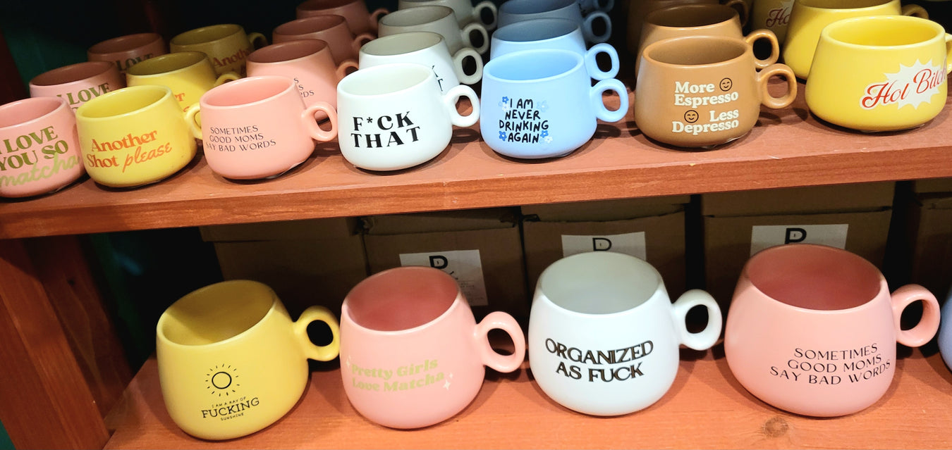 Check out these new products from Properly Improper at The Rocket! Express how you feel while you enjoy your morning coffee or espresso with these mugs. The large mugs have an 11 ounce capacity, while the small ones have a 2 ounce capacity. They have a smooth matte finish over handmade ceramic. The graphics are printed on one side. Find your new favorite mug or a great gift that is sure to make them laugh.