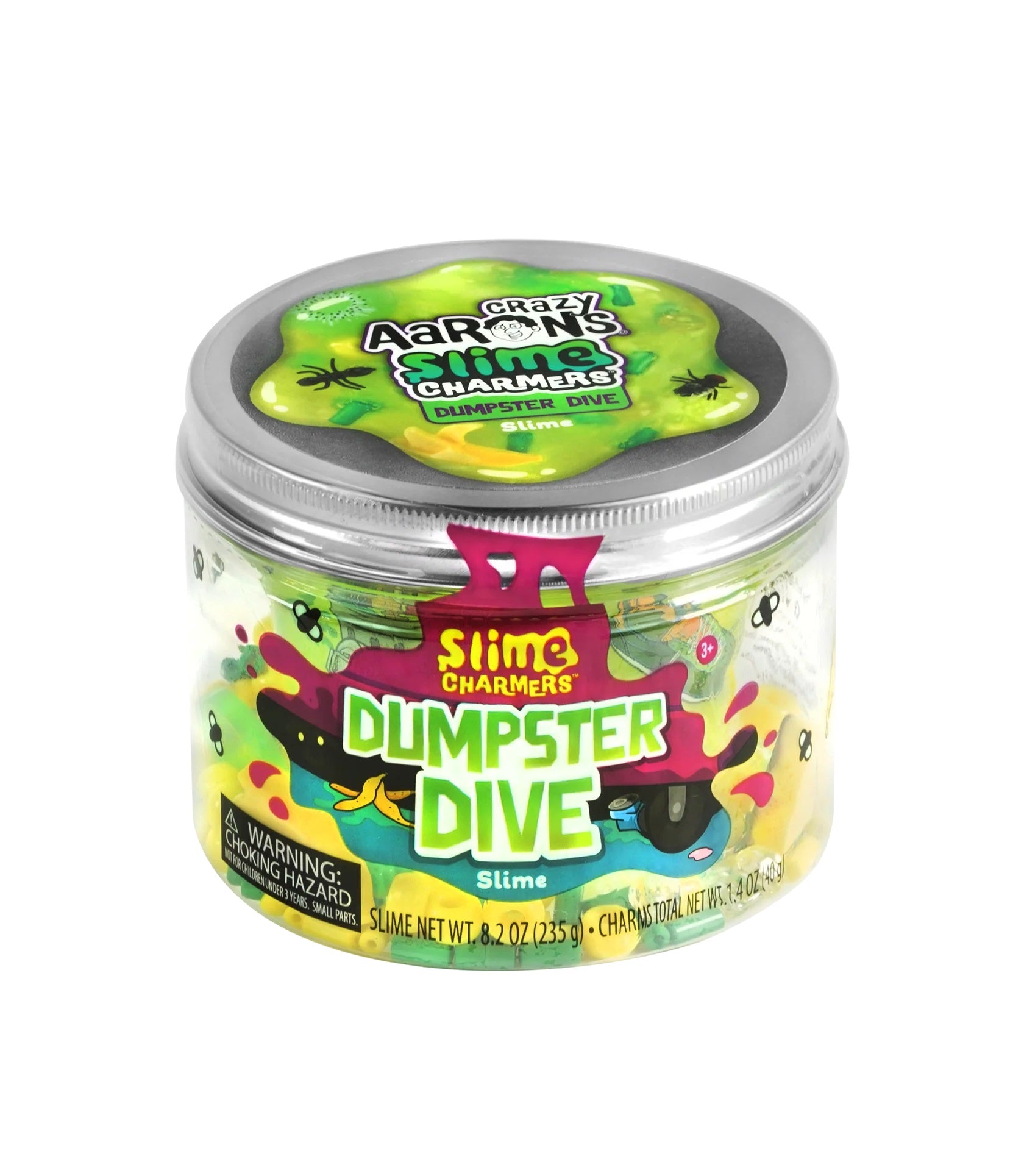 It’s time to jump right in with the new Crazy Aaron’s® Slime Charmers™ Dumpster Dive. This classic green slime comes with charms that will make you want to dive for more. Food scraps, creepy crawlers, crystals and more! Mix, pick, pull, stretch, and create to turn your trash into treasure with Slime Charmers™ Dumpster Dive!