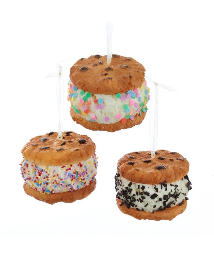 Add some sweetness to any holiday decor or Christmas tree with these ice cream sandwich ornaments. Each ornament features ice cream in between two chocolate chip cookies made of realistic looking polyurethane. This assortment includes vanilla ice cream with multicolored colored sprinkles, multicolor confetti sprinkles and chocolate shavings.