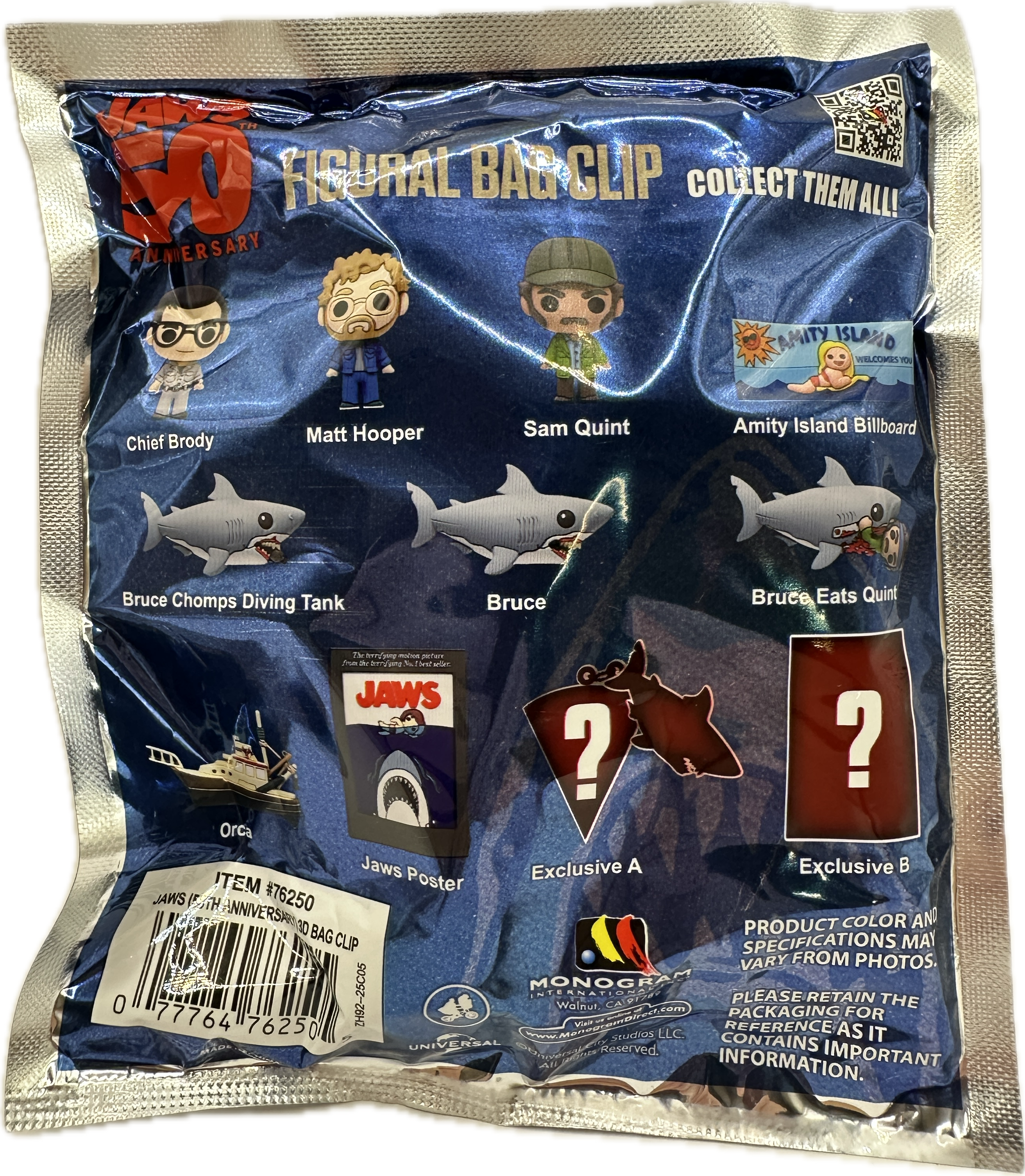 You will receive one random Jaws 50th Anniversary clip in the bag. These are fun to hang from backpacks, hence the name bag clip.