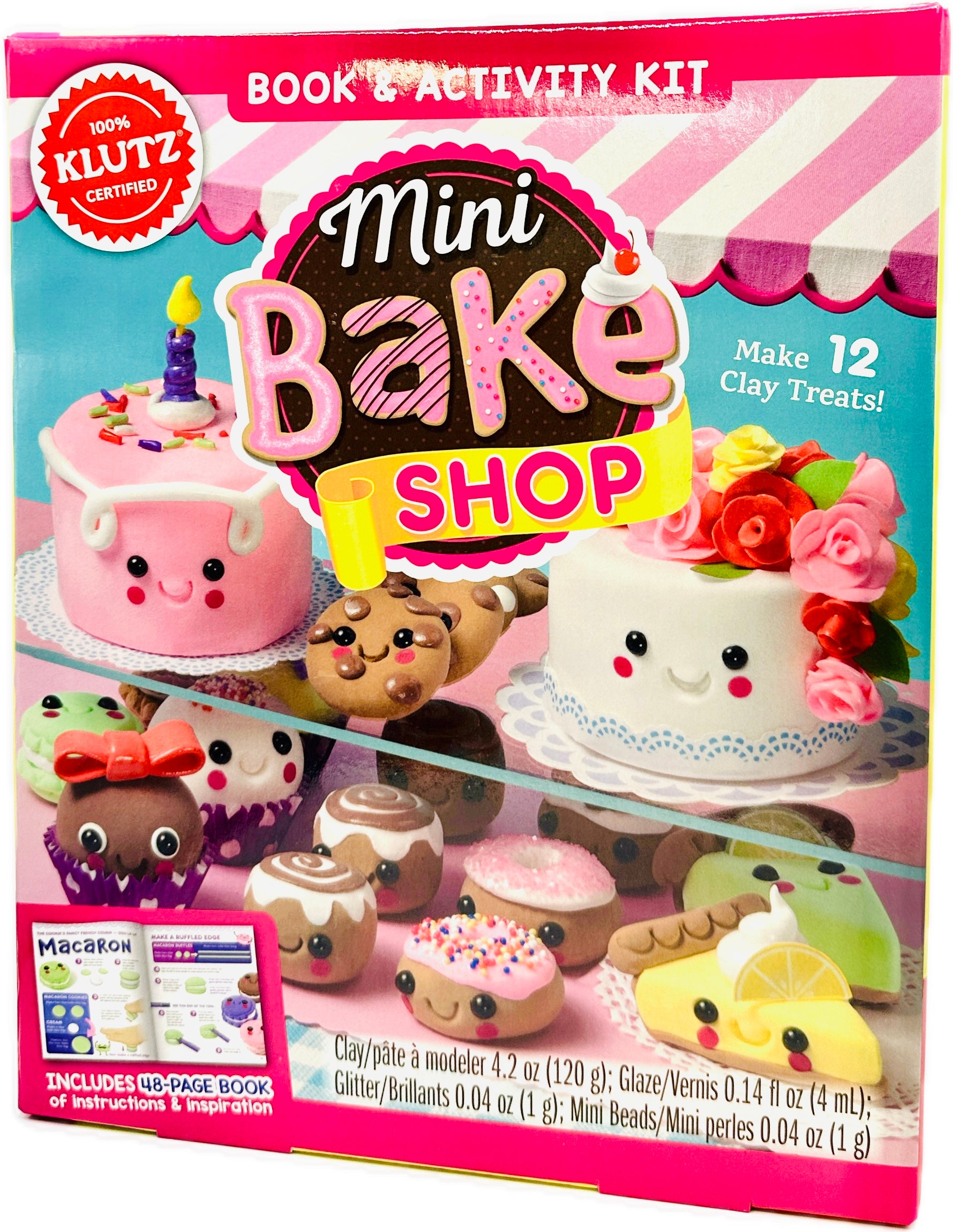 Comes with: 8 colors of air-dry clay, Double-tipped clay tool, Rolling tool, Glaze, Glitter, Micro beads, Bead eyes, Pearls, Sequin cheeks, Mini cupcake papers, 8 Styrofoam shapes, Cake stand, Bakery box, 99 punchout