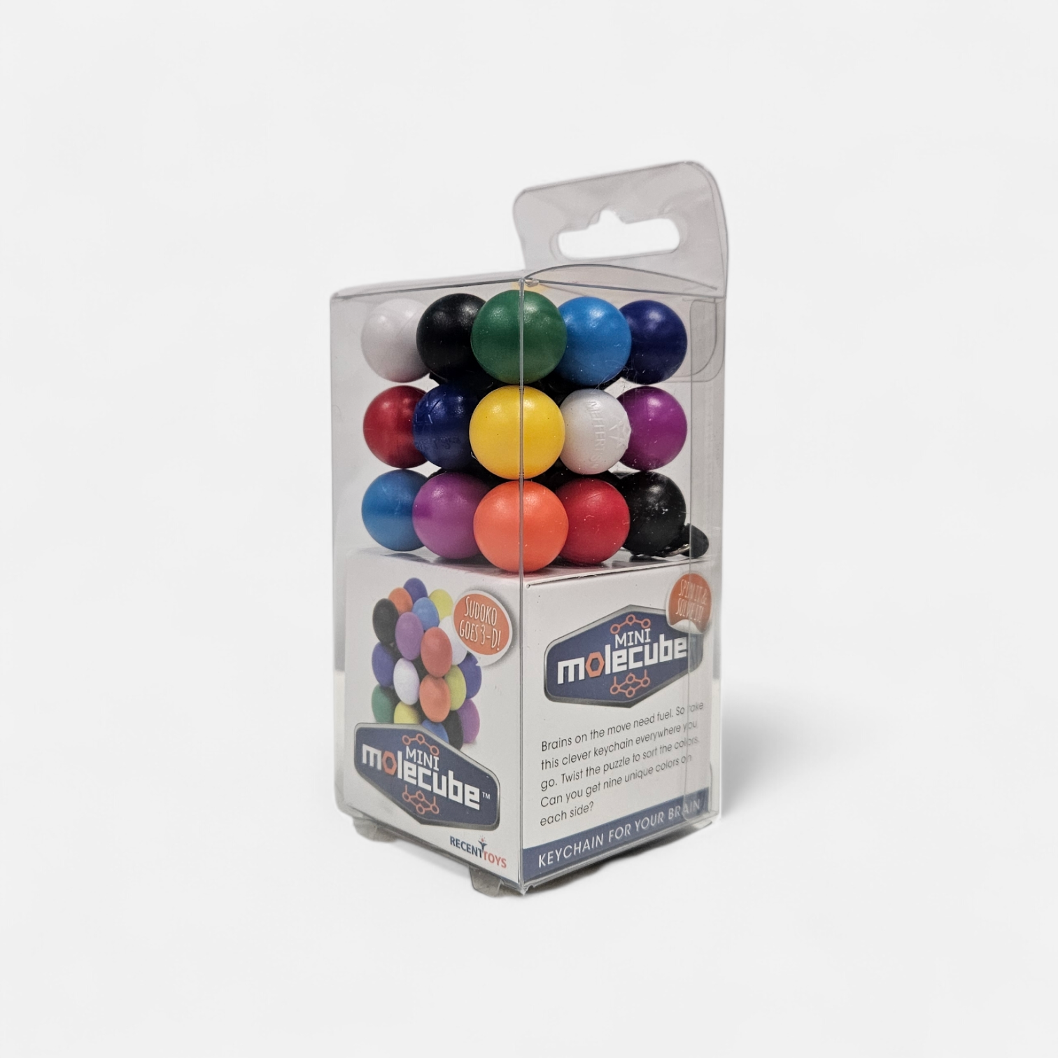 Building on the enormous global success of Meffert’s Puzzles, we are excited to bring you the Mini Molecube Keychain! Brains on the move need fuel. Take this clever keychain everywhere you go! Twist the puzzle to sort the colors. Can you get nine unique colors on each side?