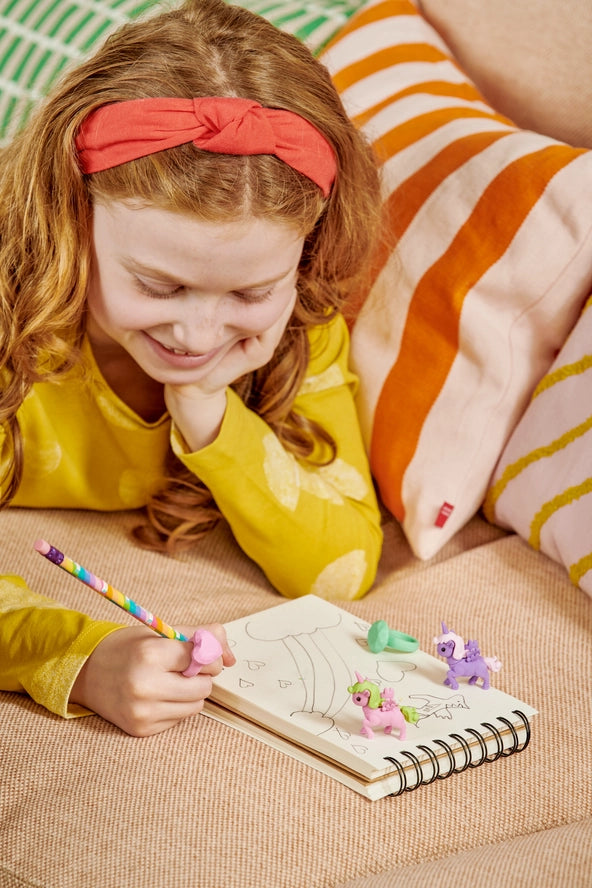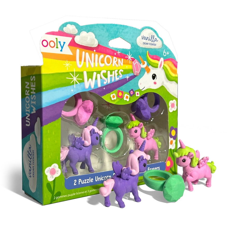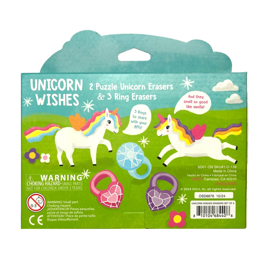Includes 2 unicorn puzzle erasers and 3 ring erasers